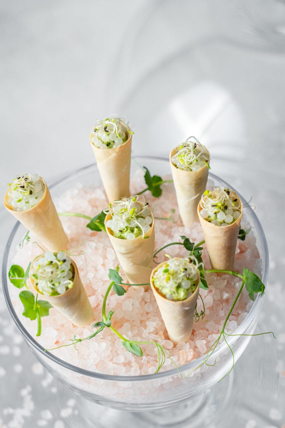 Приготування начинки: Підготовлене розм’якшене вершкове масло з’єднайте з подрібненою зеленню та сіллю, перемішайте та начиніть конуси. Зверху викладіть ікру равлика та прикрасьте зеленню.