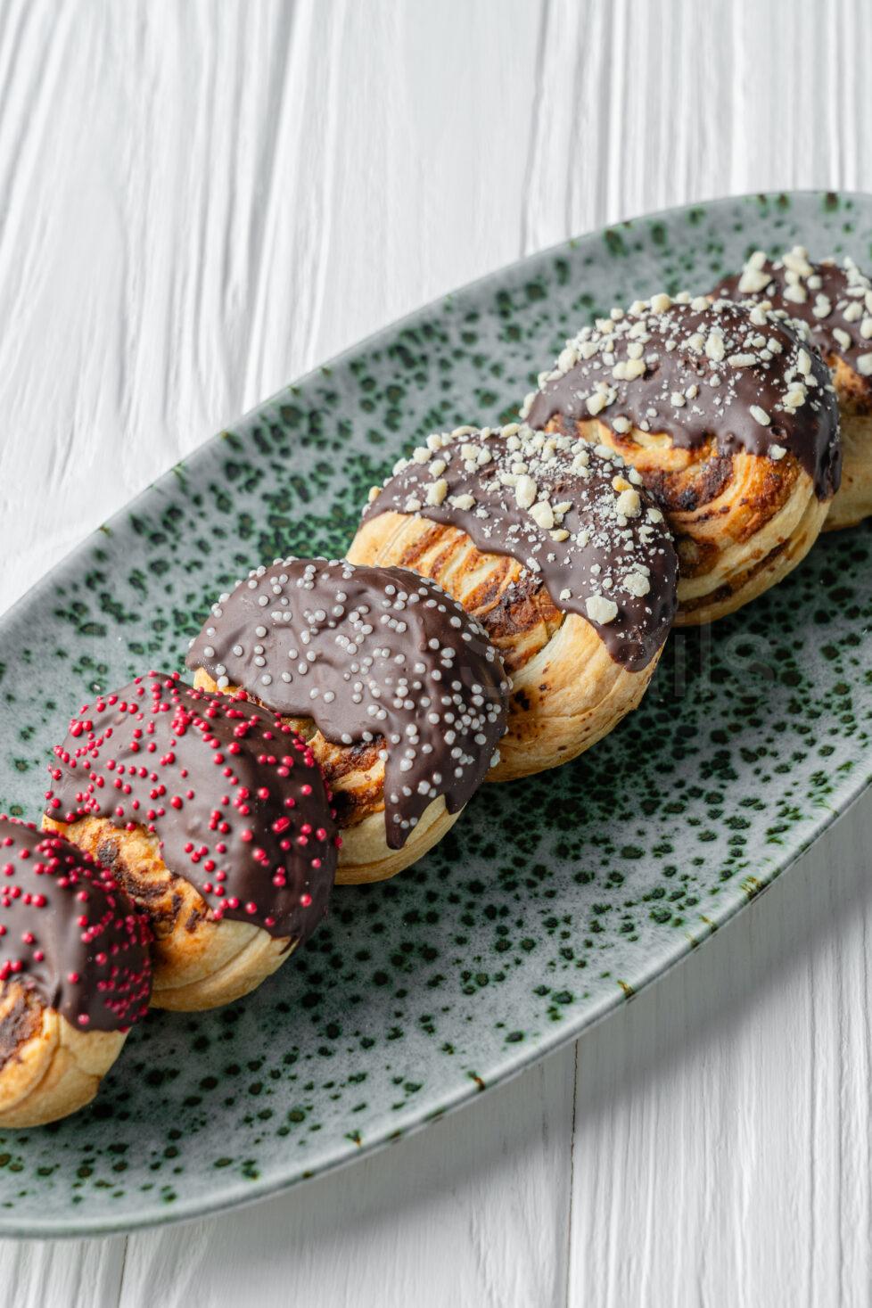 Приготування круасанів: Листкове тісто розморозьте, розкачайте тонким шаром, наріжте на трикутники та сформуте круасани. Випікайте при температурі 180 С впродовж 10-15 хв. до світло коричневого забарвлення.