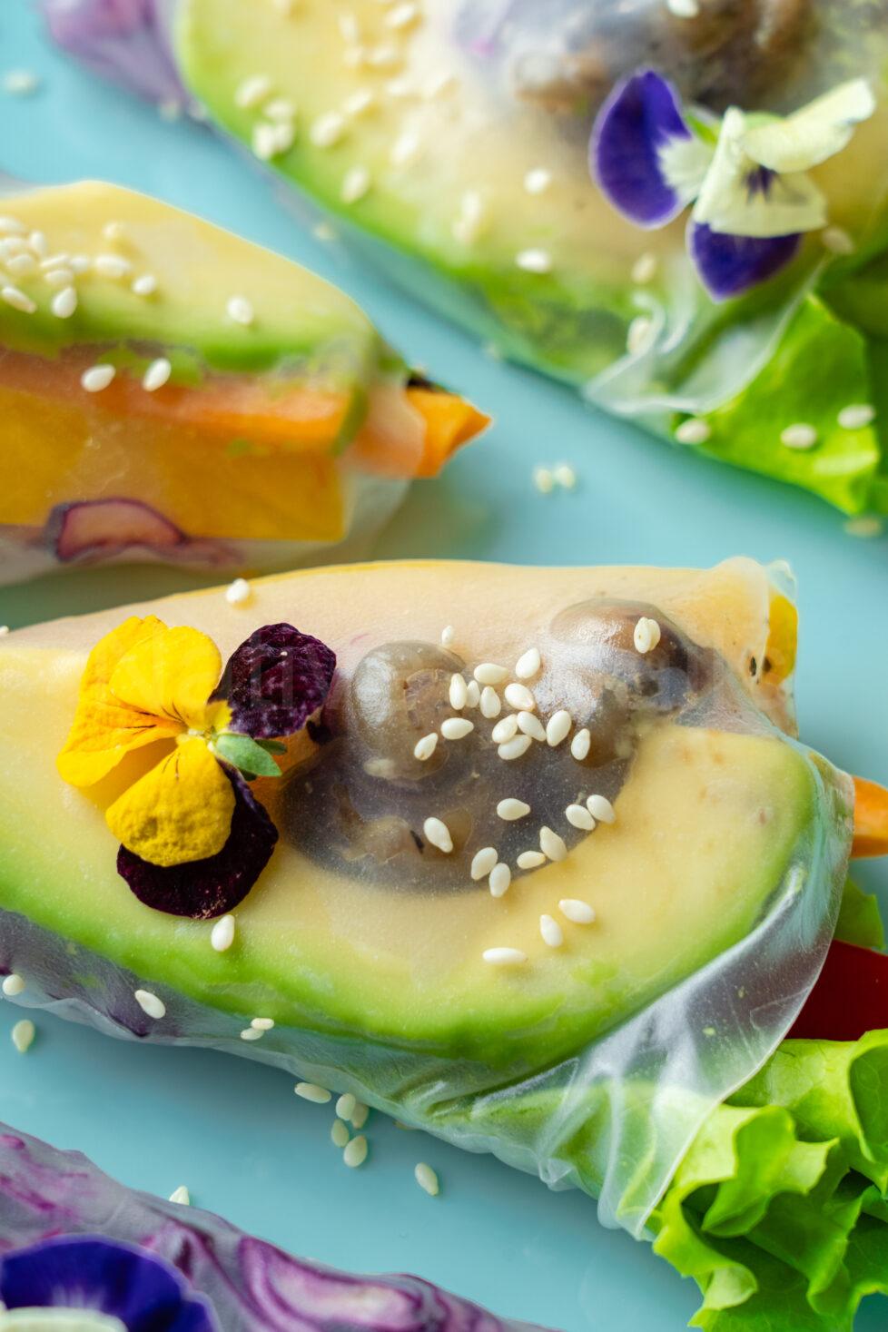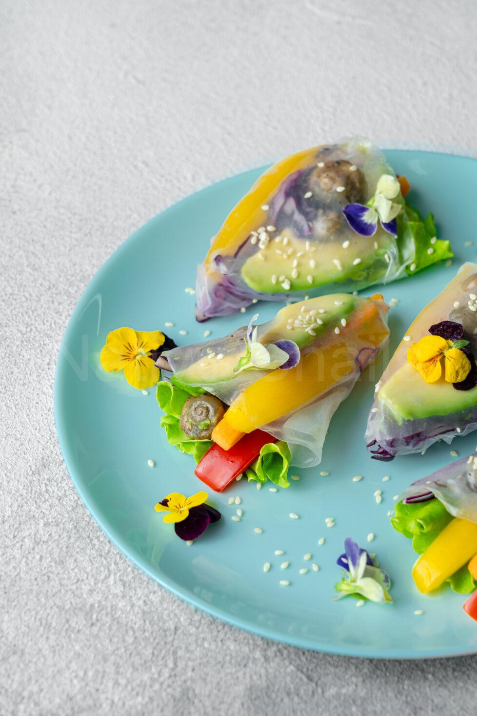 Овочі наріжте шматочками довжиною 7-8 см. Рисовий папір розріжте навпіл, замочіть у холодній воді, приберіть зайву вологу та викладіть на нього підготовлені овочі, зелень та мариноване філе равлика. Сформуйте конверти таким чином, щоб яскраві овочі гарно проглядалися.